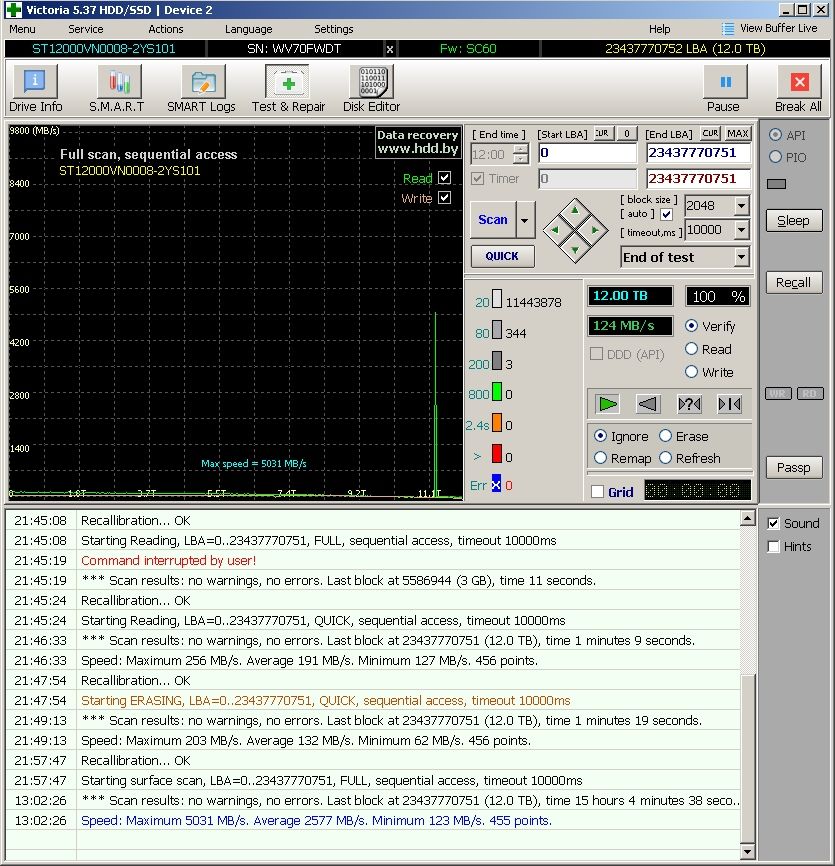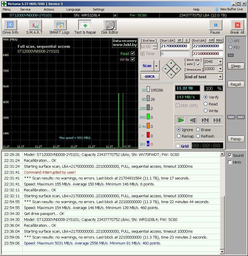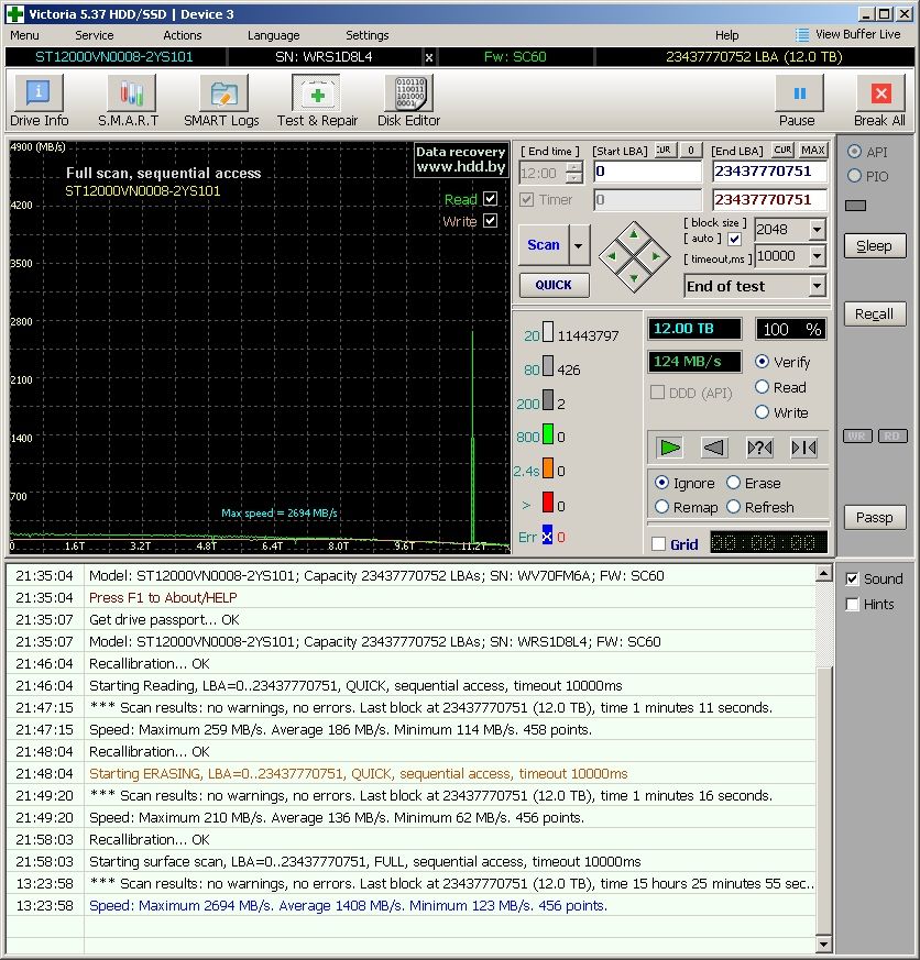 I tested all the four 12TB with Victoria 5.37. The disk which failed (Serial xxxxD8L4) showed a very strange Read - Write graph with a Read SPIKE of 2694MB/s. I re-tested the drive on a shorter LBA, 217e7 to 221e7 and again had two spikes (5031MB/s !!!), I repeated it, no spikes, tried slighlty different intervals 215e7 to 220e7 and 220e6 to 225e7 , which again showed no spikes, and concluded that the spikes were aberration caused by something else ( the PC was also Recording and Saving streams using VLC, maybe that cause an I/O delay somewhere which was seen by Victoria as a spike – which is weird anyway, a conventional HDD CANNOT read a block at 2000MBs or 5000MB/s.