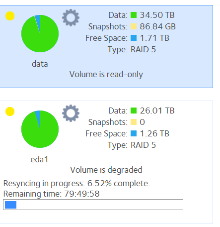Before you re-boot, it may also be a good idea to EXPORT and disconnect the (fully re-synced) EDA volume. If you end up having to factory default, you can later add an exported volume, but you cannot add a volume that wasn't. And if you end up just having to destroy and re-create the main volume, the act of destroying it with the EDA attached will make the EDA volume primary, which is not a good situation with the eSATA multiplier interface it uses. If all ends up well after the re-boot, or after you fix the problem, you just power down, re-connect the EDA and power up, which will automatically import the EDA volume. Just make sure you don't duplicate any share names from the EDA if you have to start over with the main volume.