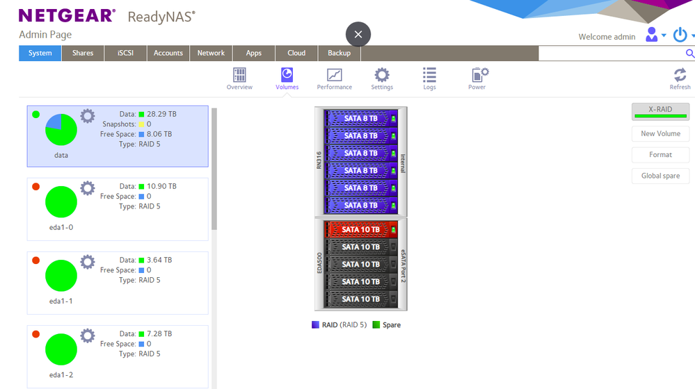 If I turn one of the EDA500s on, it shows up as a mix of unusableness.If I boot up the NAS while the two EDA500s are powered on and connected, the NAS shows every drive as red.