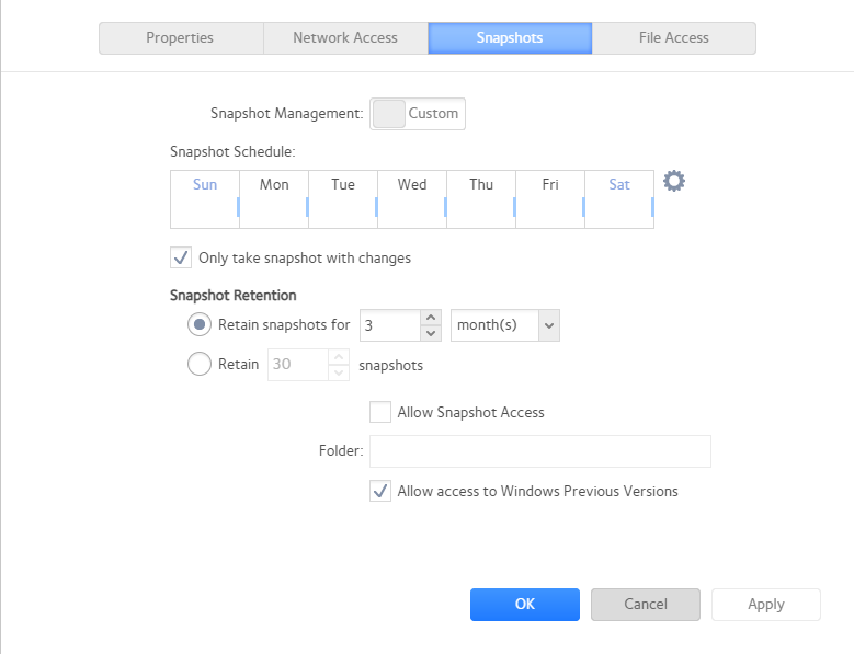 Then I periodically take a look at the total space used by my snapshots. If it rises higher than I want it to, then I just adjust the retention downwards (which can be done on a share by share basis). But I haven't had to do that for a long time. Even with 3 months retention, I am only using about 3% of file space for snapshots. Of course the amount you will use will depend on how often you modify or delete files.