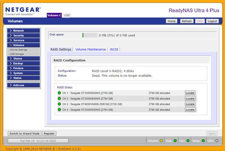 I have a ReadyNAS Ultra 4 Plus that I use primarily for storing music. It has four Seagate IronWolf drives (3x3TB + 1x4TB) that show green buttons. The volume is also completely accessible, readabl...