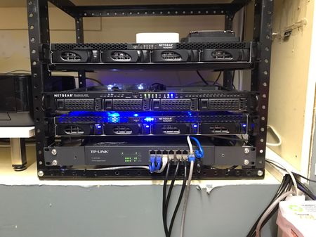 Also, if your rack isn't protected by a UPS, you should consider adding that. Lost writes can result in loss of RAID sync (which can lead to data loss), and power surges can damage disks. You could protect the two NAS and the switch with a single UPS. The main NAS can monitor the UPS via USB, the backup can monitor it over the network (from the main NAS). Then both NAS have some protection against power surges, would remain operational during short power glitches, and would cleanly shut down during an extended power outage.