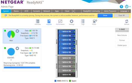 RN316 OS 6.7.5 EDA500 I have created a RAID 10 set on my EDA500. It consists of 4x4TB Seagate ST4000DM000 disks (5 are installed in the EDA500). It has not finished syncing yet, but it's repor...