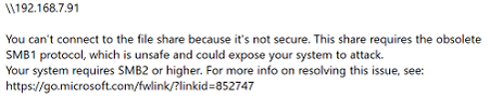 Attempted to enable SMB2 per the instructions linked below; namely, added the line min protocol = SMB2 to the [Gobal] section of the /etc/samba/smb.conf file on the NAS. Then restarted the NAS, but u...