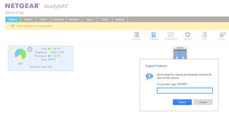 Not specific to your finding, but I hope you aren't actually doing an export of your primary volume. That's not normally used with a primary volume. If you are moving it to another NAS, you just move it with power off. Exporting it will make it no longer function as a primary volume.