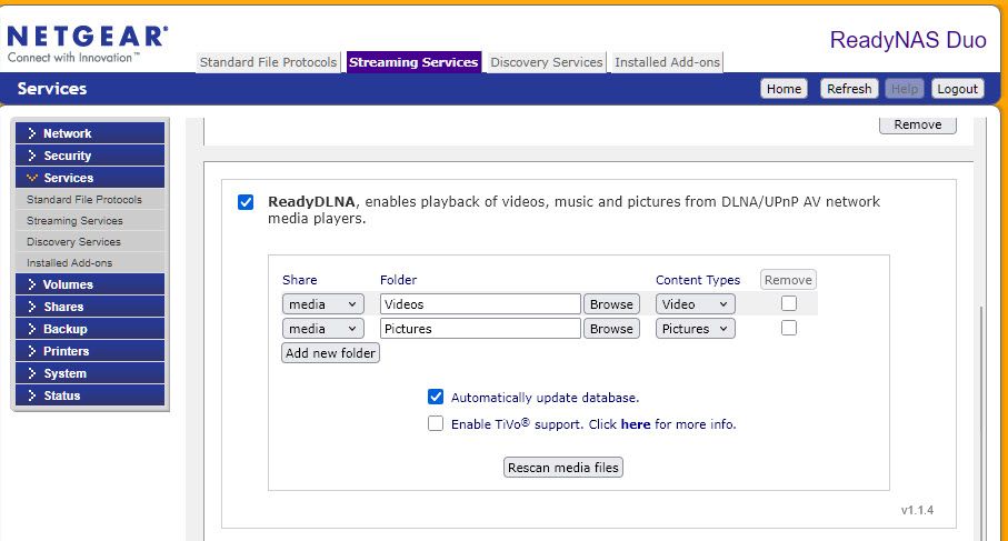 Your media player to find and stream content from your ReadyNAS Duo v1 (running RAIDiator 4.1.16), is typically called ReadyDLNA (or sometimes referred to as the iTunes Streaming server). To access this setting, you must navigate through the device's web administration interface, known as FrontView. First, log in to FrontView using your device's IP address in a web browser. Once logged in, locate the primary navigation section labeled Services. Within the Services menu, you will find a submenu or option for Streaming Services (or sometimes just ReadyDLNA), where you can enable or disable the media server function so that devices on your network can discover and access your shared media files.