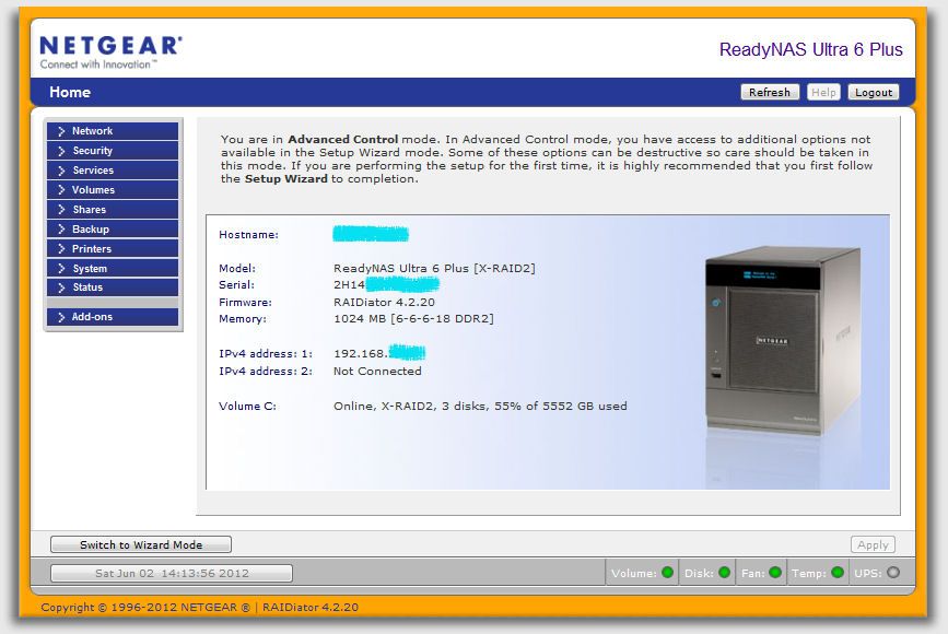 With regards to the firmware which was installed when I set it up, if was 4.2.15. Once registered the first thing I did was to update it to the latest version as I know that 4.2.15 is unsuitable for the 3TB drives. This took most of Thursday to complete as it took 5 hours alone to reconfigure the drives once the new firmware had been installed. - mdgm-ntgrNETGEAR Employee RetiredSounds like Frontview from 4.2.15 was cached which was why you couldn't see the new Add-Ons Menu which was added in 4.2.16.