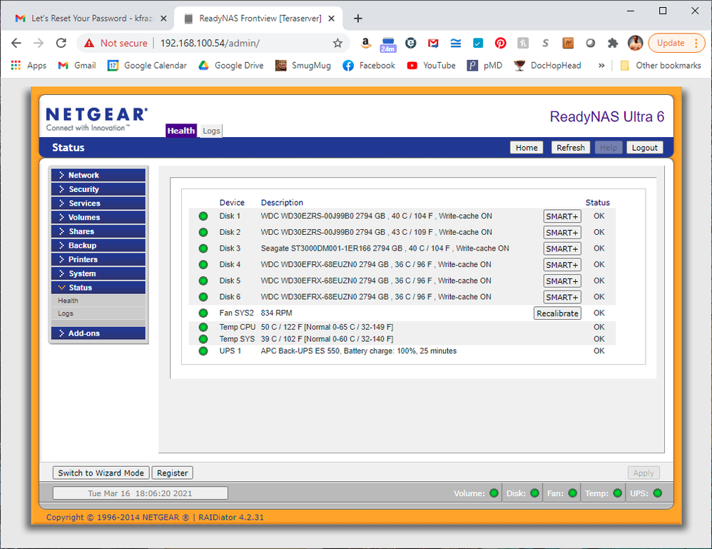 I recently had a drive fail. I've been using Netgear NAS's for almost 20 years, replaced numerous disks when alerted that there were increasing SMART errors. But this time I had no warning and only a "No volume exists" error. Under "status -> health" I saw this: