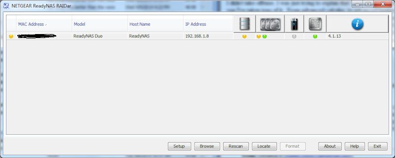 I have RAIDar 4.3.8 installed on the Win7 PC. RAIDiator 4.1.13 was installed on the ReadyNAS Duo via the ReadyNAS Download utility rather than from a file on a PC.