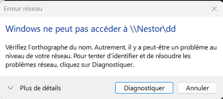 Bonjour, Je n'ai plus d'accès à mon NAS depuis quelques temps. J'obtiens l'erreur suivante : Si quelqu'un pourrait m'aider... Merci d'avance.