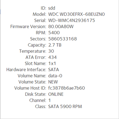 | 10 Feb 2022 08:41:52 PM | Disk: Detected increasing ATA error count: [434] on disk 1 (Internal) [WDC WD30EFRX-68EUZN0, WD-WMC4N2936175] 5 times in the past 30 days. This condition often indicates an impending failure. Be prepared to replace this disk to maintain data redundancy. | |