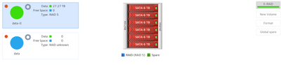 In an effort to try to resolve this, -when I restarted the Nas system and found out of the problem-, I tried to remove/ isolate the drive that was reported as failure during the resync (now working with no issue) in slot 1, inserted the old drive that was replaced back in its old slot (slot 4), hoping everything will go back to where we started and should have worked normal, but nothing, it's exactly the same red Raid and two data volumes data (27.7TB) and data-0 (0TB). After going through the relevant KBs, Now I probably understand why that may be the case, since the BTRF journal could have got corrupted as a result of the sudden interruption in the sync, and therefore the system could not mount back to the original data volume.