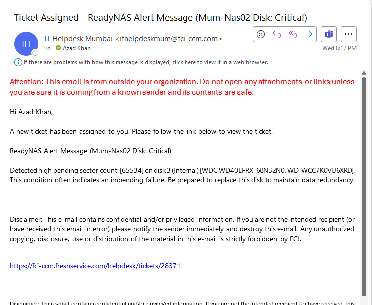 ReadyNAS Alert Message (Mum-Nas02 Disk: Critical)