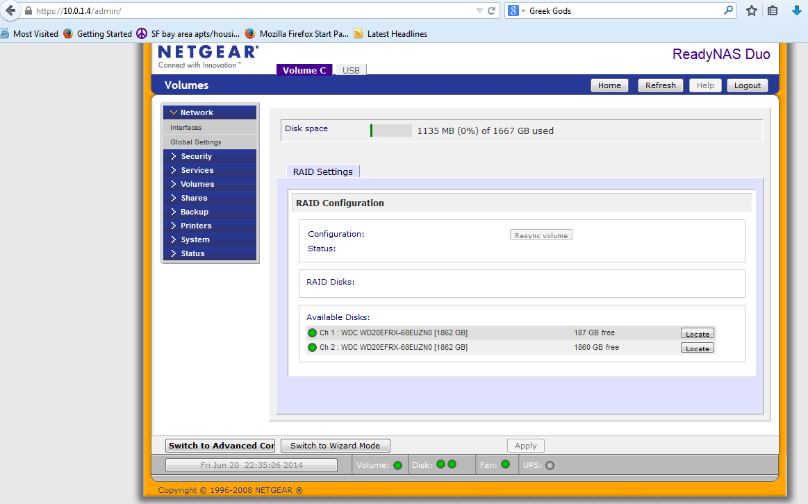 My NAS is a ReadyNas Duo V1. I am trying to set it up for the first time and want to make sure that the two disks I put in our in Raid mode. I'd like it so that if one fails, I can just put another one in and everything works. However, this is what the relevant screen shows: