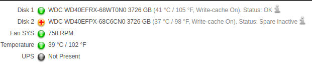 I had two 4 TB WD WD40EFRX installed. Some time ago one of the disks stopped working (the one in bay #2)