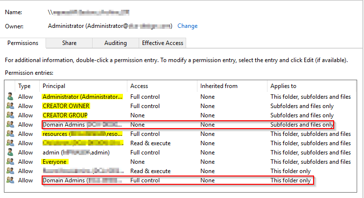 When you look at the file access tab in the share settings are you seeing "administrator" as the folder owner, and "domain admins" as the folder group? What are you seeing on the file access tab for the source share?