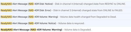 I have had no problems with my ReadyNAS RN104 for 7+ years in RAID 5, when a few days ago I got this message: "Disk in channel 4 (Internal) changed state from ONLINE to FAILED." I had been running wi...