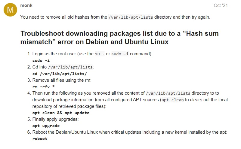# sudo apt-get install -y libc6-dev Reading package lists... Done Building dependency tree Reading state information... Done The following additional packages will be installed: libc-dev-bin linux-libc-dev Suggested packages: glibc-doc manpages-dev Recommended packages: manpages-dev The following NEW packages will be installed: libc-dev-bin libc6-dev linux-libc-dev 0 upgraded, 3 newly installed, 0 to remove and 37 not upgraded. Need to get 790 kB/3,027 kB of archives. After this operation, 15.1 MB of additional disk space will be used. Get:1 https://apt.readynas.com/packages/readynasos 6.10.7/main amd64 linux-libc-dev amd64 4.4.218.1 [790 kB] Err:1 https://apt.readynas.com/packages/readynasos 6.10.7/main amd64 linux-libc-dev amd64 4.4.218.1 Hash Sum mismatch Fetched 790 kB in 0s (863 kB/s) E: Failed to fetch https://apt.readynas.com/packages/readynasos/dists/6.10.7/main/pool/l/linux/linux-libc-dev_4.4.218.1_amd64.deb Hash Sum mismatch E: Unable to fetch some archives, maybe run apt-get update or try with --fix-missing?