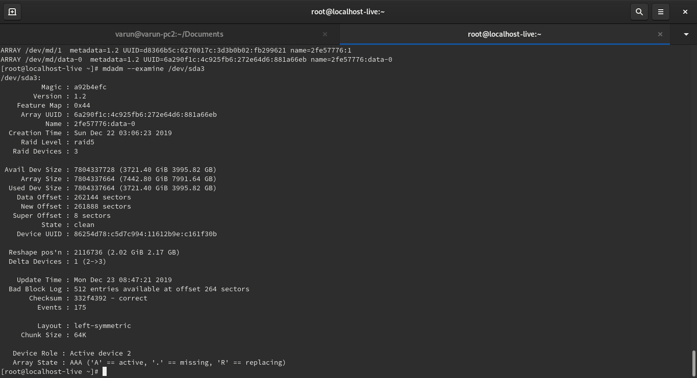 I took out both the drives and connected to one of Linux (Fedora) system. I can see the software raid partition on that drive and md volume but inactive. Is there a way I can mount this volume on Linux and access my data from there. Attached are few outputs related to that. md125 (sda3) is the volume I guess which holds the data. Please help.