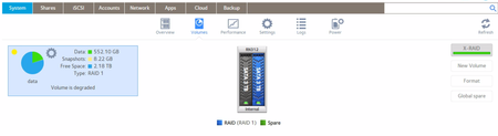 RN312 (2x 2TB RAID1) now reporting volume degraded, but interface gives no clues as to why. I can see a picture of two drives, one grey, one blue, both with green "leds". Hovering over both shows bot...