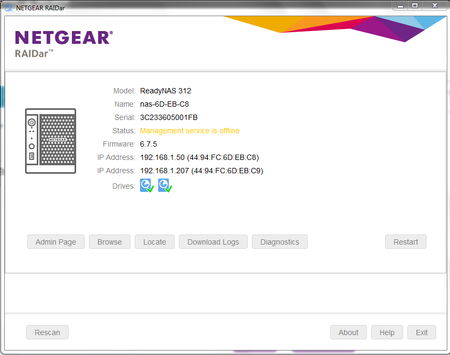 Data stored on our RN31200 has become inaccessible. Upon using RAIDar, I see that the "Management service is offline". I have tried the following in this order: Restart Reinstall OS Upgrade fi...