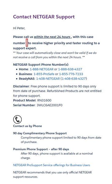 i tried request RMA from my.netgear.com ("replace my defective product") and i get respose with NO case number (as is shown on 1st entry of this conversation). Netgear messed up my unit registration so now my.netgear.com (and repairing registrations is not done after nearly a year from reporting to them) telling me that i have NO HW warranty (I bought RN316 2017/12)