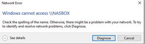 The NASBox cannot be accessed on my main laptop as of five days ago. I've rebooted the laptop, the router and turned off the NASBox. The box is shown in the list of network but I can the error shown ...