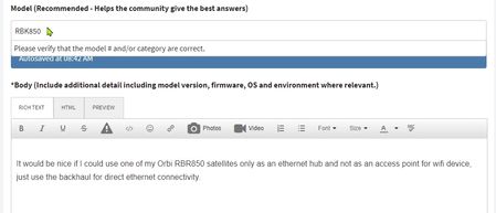 It would be nice if I could use one of my Orbi RBR850 satellites only as an ethernet hub and not as an access point for wifi device, just use the backhaul for direct ethernet connectivity. ...