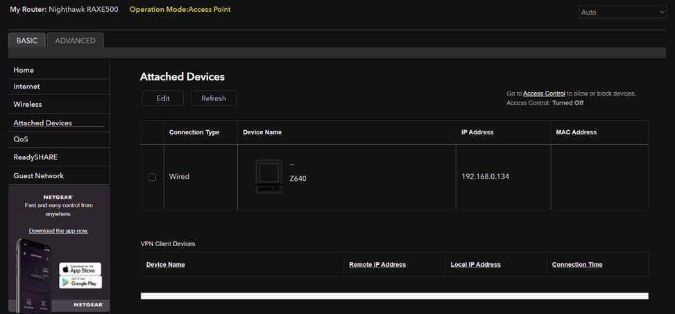 Navigate to Basic Tab/Attached Devices. Verify any devices appear here that are connected to the NETGEAR router while in AP Mode. All ethernet and wireless connected devices will appear here: