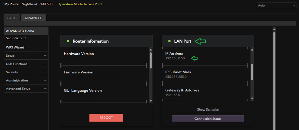 IP Address set on NEGEAR router for AP mode is 192.168.0.50