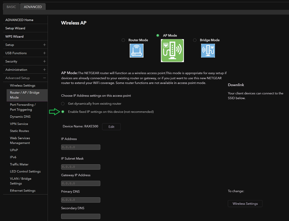 Summary: This detailed process outlines how to use NETGEARs AP mode feature and use the AP Mode Static IP address configuration vs the Dynamic IP Configuration. This sets a specific IP address on the router to be configured as a wired AP which allows the IP address to be static and not change as when using Dynamic IP address configuration, the IP address given here can be change depending upon host router DHCP IP address configuration and lease time.