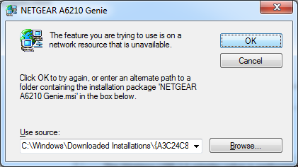 Products: A6210 WiFi Adapter Neatgear A6210 Genie The Netgear upgrade process failed and I am unable to perform a "manual" upgrade. The consequence is that the Netgear A6210 Genie no longer works, and I am unable to get it to work. Initial symptoms: I received and automated Netgear Genie prompt advising that a later version of the software (or firmware, I can't be certain) was available, and asking me if I wanted to upgrade. I replied "OK" and followed the steps. During the installation cycle, I received the following prompt: I checked for the target folder contained in the "Use source" box above and it does not exist. There are two folders with "NETGEAR A6210 Genie.msi" files on my system: C:\Windows\Downloaded Installations\{2BCF486D-314D-4C87-83F8-56BB24617141} C:\Windows\Downloaded Installations\{D7C2F4A3-B5BD-464A-A453-DE7B3D911FDF} I used "Browse…" to navigate to these files. In both cases, I received a prompt [along the lines of ] "the older version file is not valid…" I searched my system for any other instances of "NETGEAR A6210 Genie.msi". These are the only two. So… the upgrade failed and now the Genie will no longer run. Next Steps 1: I attempted to complete a "manual" upgrade. I downloaded "A6210_v1.0.0.34.zip" and followed the installation process. One of the step in that process is: To properly install adapter software, please remove drivers that were previously installed. To uninstall, go to Start > Programs > NETGEAR A6210 > Uninstall NETGEAR A6210 . I followed this step and now get: Next Steps 2: On the off chance the above message is spurious and the uninstall actually worked, I have attempted to install the upgrade. It repeats the symptoms described under Initial symptoms (above). Current Status: Netgear Genie not working and any attempt to upgrade/fix fails.6.1KViews0likes3Comments