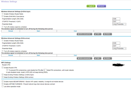 So - I've had my R6300v2 for a day. I've fiddled with most settings and I'm happy that for most things it'll do what I need. ALL EXCEPT WPS! A week ago I ordered a D-Link which shocked me when I found the WPS couldn't be turned off AND the unalterable PIN was printed on the base. Sent it back. Very odd as I have a little DIR-615 which CAN turn WPS on/off and alter the PIN all from the web interface. I looked at NetGear models, read through User Guides and went for the R6300. I definitely got the impression that you could turn WPS on or off. I've tried a whole bunch of variations but WPS stays on regardless ... ON THE TWO MAIN SSIDs. Quite interesting to note that WPS does not appear on the Guest SSIDs when activated. For a moment I thought I had the answer to my problem - use the Guests and disable the main ones. Alas - as you are probably already thinking - turning the main SSID off disables that WiFi frequency entirely. So, I'm left wondering WHY has this feature been omitted? And why is there no official response to at least one of the previous WPS threads on here? In fact, if you search, you'll find one respondent even says they were treated poorly by telephone support when they contacted them. I refuse to believe that a feature available in older hardware is now impossible to implement. The underlying silicon almost certainly has been developed from older designs and they are unlikely to have removed any features. So, come on NetGear - one (or more) of your bright developers needs to say, "You know, there are a lot of articles discussing the problems and insecurities of WPS, as a Google search of the last month shows. Perhaps we should give our customers the ability to turn it off if they want. No-one will moan if we give them more features."Solved