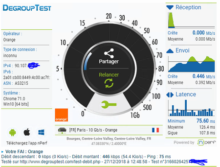 Bonjour, La clé se connecte et windows l'indique comme connectée à internet mais elle souffre de nombreux problèmes de coupures. La clé marchait bien puis je l'ai installé sur un nouveau PC. Il est sur Win 10 Pro x64. La clé a été installée avec les derniers drivers du site netgear. Il est connecté à une livebox de Orange. La connexion Ethernet n'a aucun souci. La connexion WIFI sur un autre PC ou sur les portables n'a aucun souci. Pire: la connexion WIFI avec cette clé Netgear testée sur un autre PC de la maison marche parfaitement! Je tourne en rond et j'ai essayé toutes les commandes ipconfig et netsh. J'ai effectué un test de débit en passant par la clé. Ca se coupe dans le test de réception et il y a des problemes aussi dans l'émission et le ping: Et voici le même test à partir d'un autre PC de la maison en WIFI lui aussi sur la livebox: Merci pour votre aide!2.6KViews0likes3CommentsProblème avec ma clé wifi