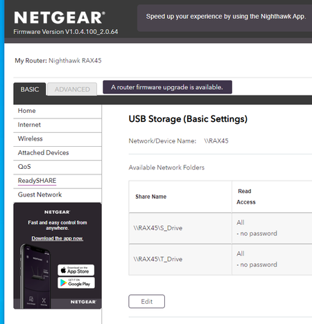 I have a two bay USB drive connected to my RAX45. I use ReadySHARE->USB Storage (Basic Settings)->Edit to enter new share names. (See picture below) Things work fine until I reboot the router. After that, the \\RAX45\S_Drive gets changed to \\RAX45\USB_Storage. This has happened every time. I would have expected the router to remember the name. Is the name used here actually stored on the drive instead of the config data inside the router? I see older complains similar to this on this site. But the suggested solution there is to reboot the router.RAX48 Firmware Update - GUI language file is invalid