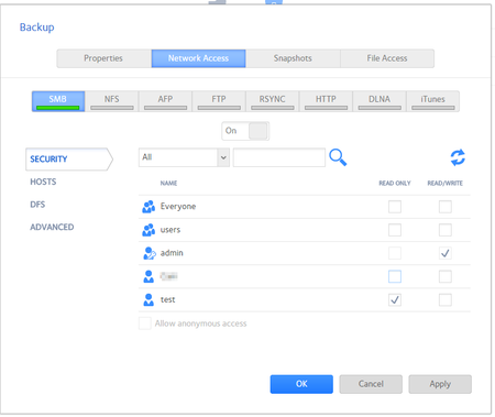 Hello everyone. I've been using ReadyNAS for a few years and I have fairly simple file access security requirements. I have stumbled upon the "right" settings a few times and have just left it for ages. I'm now trying to change something and I realise again how little I understand what's going on here. Any help would be great. What I want: Backup SMB Share Admin user: Read/write Test user: Read only Everyone else: nothing. IE no guest access etc. How I assumed this is achieved: What I get with the above settings. Admin account works: When I browse the share in Windows 10 File Explorer it asks for credentials, I use admin and I’m in with Read/Write permissions. Test account gets denied: “You do not have permission to access \\readynas\backup. Contact your network administrator to request access.” Note, troubleshooting is confusing as I’ve found after mapping it with admin, “net use del \\readynas\backup” doesn’t work. So I need to reboot to properly unmap and troubleshoot with another account. Not a big deal but an FYI if someone else is having inconsistent results.2.2KViews0likes2Comments