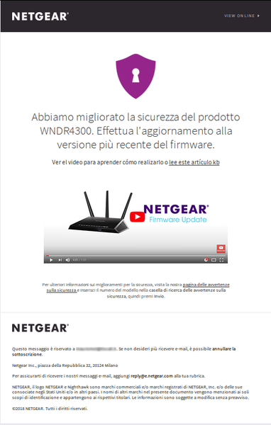Buongiorno, ieri ho ricevuto un'e-mail da parte di Netgear che mi avvisa nei seguenti termini: "Abbiamo migliorato la sicurezza del prodotto WNDR4300. Effettua l'aggiornamento alla versione più recente del firmware." Non c'è un link per scaricare il firmware, ma un video che spiega come eseguire l'aggiornamento usanto lo strumento di controllo integrato nell'interfaccia web di gestione del router. Fatto sta che l'ultima versione di firmware disponibile sul sito web e segnalata dall'interfaccia web del router è, nella migliore delle ipotesi, di febbraio 2018, si tratta della 1.0.2.98 ed è già installata nel mio router. Vorrei dunque capire se si tratta di una comunicazione estremamente ed inspiegabilmente tardiva o se c'è un problema di aggiornamento del sito Netgear per cui la nuova release del firmware, di cui all'e-mail ricevuta, in realtà non è ancora stata pubblicata. Segue screenshot della mail ricevuta. Grazie, MauroSolved7.4KViews0likes6CommentsD6000 AC750 - Avast for MAC scansione protezione rete domestica - Readyshare vulnerabile