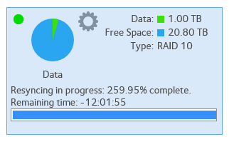 In my quest to find half usable iSCSI performance on the 3220 (https://community.netgear.com/t5/ReadyNAS-in-Business/RN3220-RN4200-Crippling-iSCSI-Write-Performance/m-p/1289066), I upgraded to FW 6.8.0, blew away the array and rebuilt it - into a RAID 10 this time - and left it re-synching overnight. I came back this morning and this is what the re-sync operation was reporting: If you jump in and out of the tab, the % and timer are still ticking. So it looks like a bug. I assume the UI update algorithm was never correctly informed that the operation was complete and the counters continued ticking.2.8KViews0likes6Comments