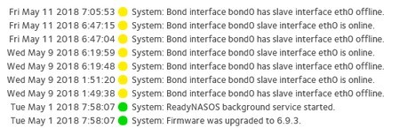 I Have a ReadyNas 3312 set up on Raid 10 at the moment with a total usable capacity of 10Tb. I've recently wanted to increase the capacity but I found out that Raid10 is not vertically expandable. Reading in the forums I think that with X-Raid I might be able to expand the raid10 but I don't think that there is a way to convert the raid10 to xraid without needing to re-format the whole partition(I hope I'm wrong), Is there a solution for me? i just want to att an additional 2Tb to the partition.. Many thanks in advance!2KViews0likes7CommentsReadyNAS 3220 FW 6.9.3: Bond interface bond0 has slave interface eth0 offline.