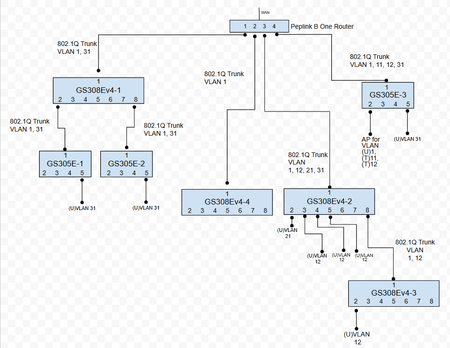 Could I please have some help or confirmation that I have these setup correctly? I'm weary that they are because I sometimes have trouble connecting to the admin interfaces on these switches. I've already locked myself out of about 5 of these (they become unreachable) and had to do factory resets and start over. Other times, I login and the admin pages don't fully load. Or sometimes they load with weird names and labels. Sometimes I logout and chrome says "no data from site". I'm concerned I'm losing some packets somewhere. But generally speaking, everything is working and the untagged (U) vlan access ports are divvying out the correct ip addresses and devices are communicating within themselves ok. I don't think I'm understanding how the uplinks/downlinks need to be tagged, or untagged. Here's the big picture. Looking at it on paper makes me feel like I'm way out of league. There's a lot of empty ports, I'm just starting. Here's the 4 port setup on the router Let me just start down the port 1 trunk (stuff on left of picture). Here's the setup of GS308Ev4-1 for VLAN1 Same router VLAN31 Same router pvid And then both GS305E-1 and -2 are setup the same which is: How am I doing?272Views0likes18CommentsVLAN - Ubiquiti/Netgear/PfSense