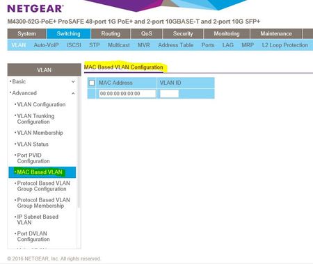 My switch is a GSM5212 with v. 10.0.2.26, (B1.0.1.1) firmware. I am tryng to configure routing VLANs with shared internet access using the guide at :- https://kb.netgear.com/30818/How-to-configure-routing-VLANs-on-a-NETGEAR-managed-switch-with-shared-internet-access I have followed the guide exactly and DHCP is working on all three VLANs but I am not able to configure the routing on my firewall and cannot be sure that I have the switch totally correct as I cannot ping the firewall from either of the VLANs not directly connected, even though the default route in the switch is set to the firewall port address. I would be grateful if somebody could please help with diagnosis of my errors!!!Solved1.9KViews0likes3CommentsMAC Based VLAN question